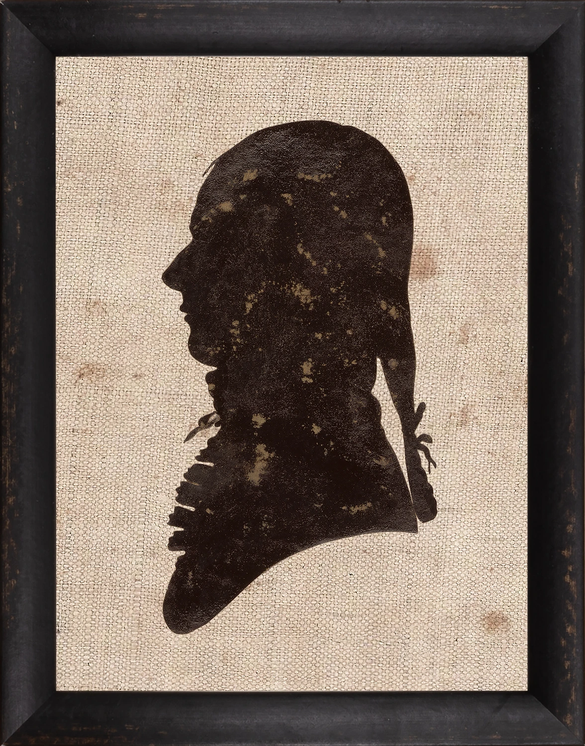 A silhouette portrait from the early 19th century. The small details in this portrait, showing the choice of hairstyle and clothing, reveal the unique character of the person within. Displayed on an aged linen texture background.