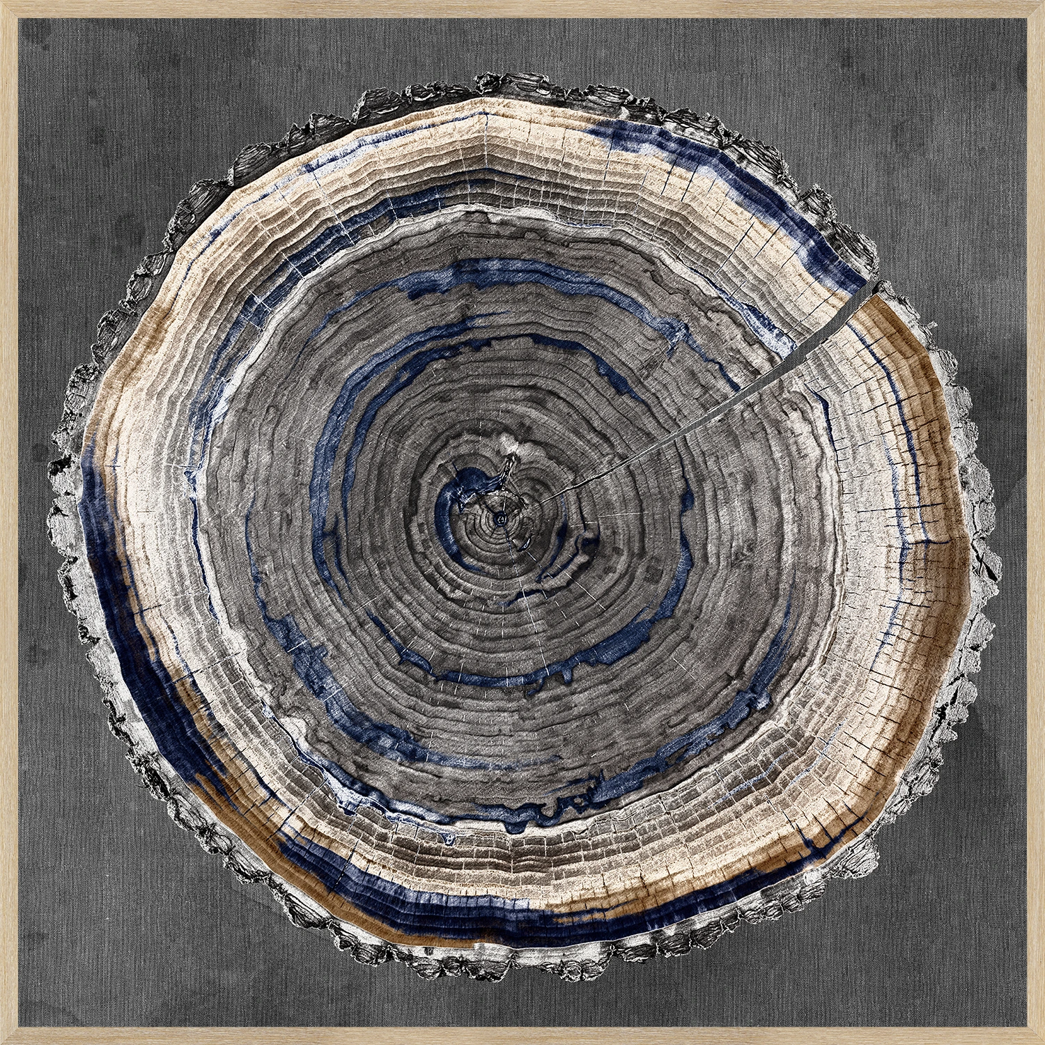 A modern farmhouse classic, these tree ring studies are artfully stained with indigo, grey and tan and contrasted against a grey flannel ground.