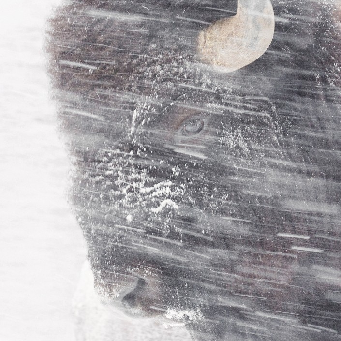 This photograph captures a portrait of a Buffalo braving a snowstorm alongside its herd. The white, hazy quality of the intense snowfall adds movement and imparts a dramatic atmosphere.