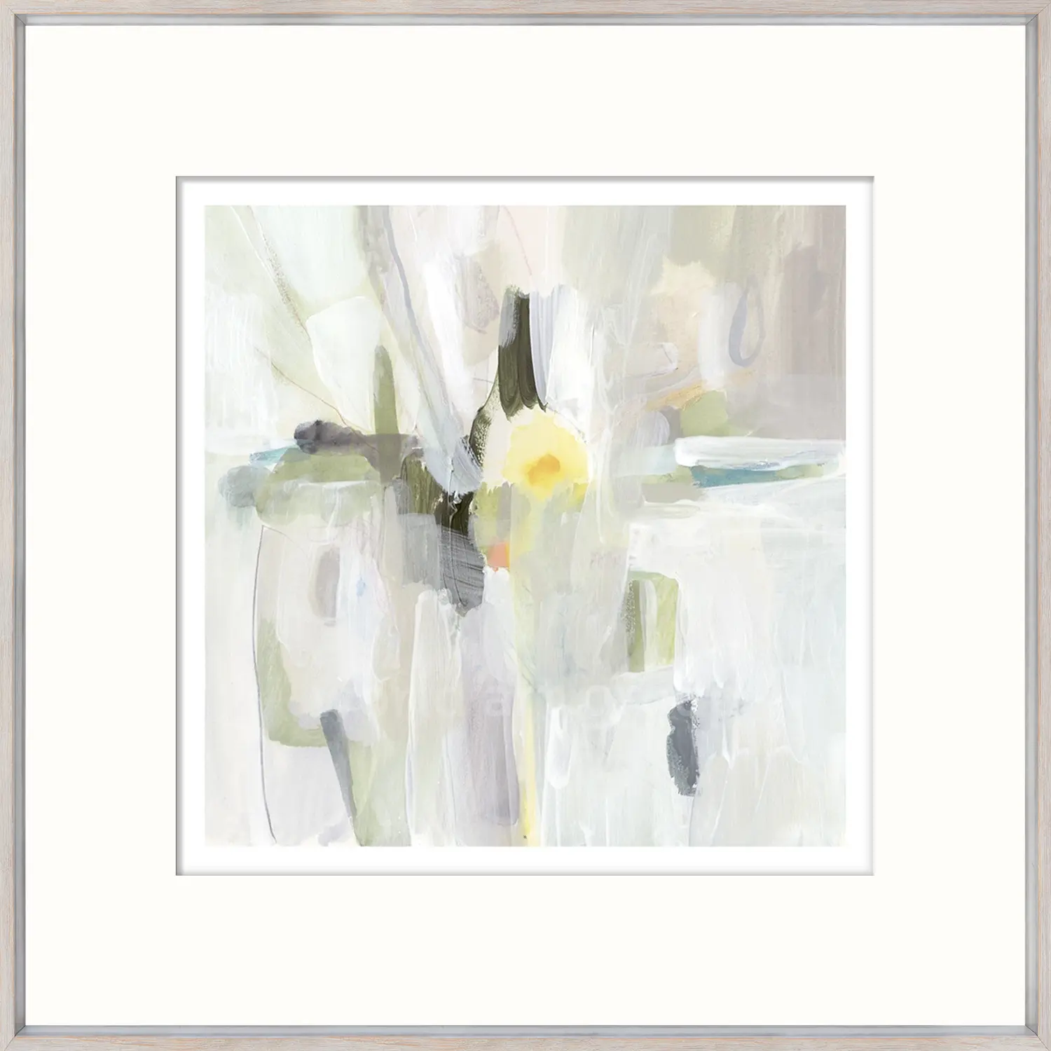 A hint of warmth breaks through the brush strokes of cool gray, energetic, overlapping strokes in this perfectly balanced abstract. Framed with a simple white washed molding with silver angled detail.