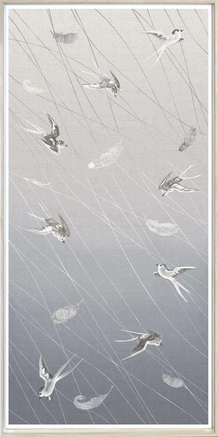 A beautiful Japanese inspired panel. Delicate birds and silver gilded feathers are set against an ombre grey linen ground with delicate diagonal lines. Set in a ivory washed frame with sliver gild lip. Stunning!