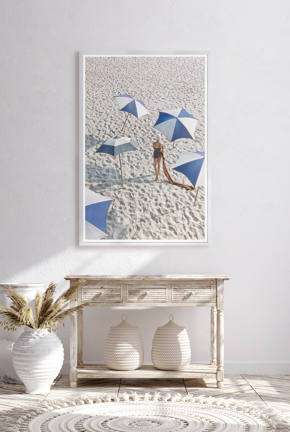 Characteristic of Frissell’s style, this photograph features a swimsuit model in motion from a unique angle. The arrangement of umbrellas surrounding her makes an interesting composition and leads the viewer’s eye through the image, following the path it seems the model is taking.