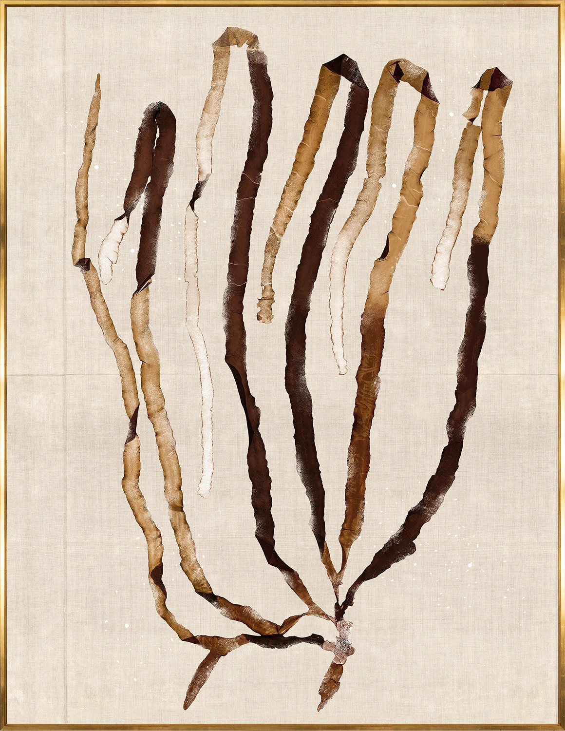 This seaweed pressing features warm tones of brown, red, white, and ivory on a soft linen ground. The delicate lines and translucent textures lend this image a sense of exquisite elegance, while its shapes and composition add interest.