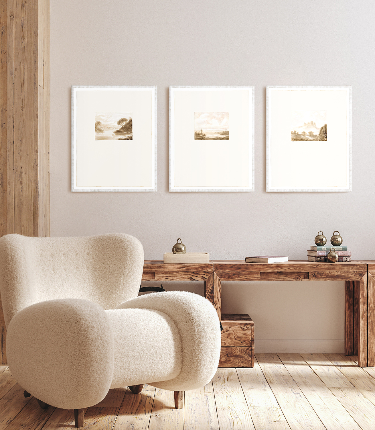 Delicate little watercolour landscapes in blush and gold. Presented on a paper texture background, these miniature works appear to have been quickly taped into an album for safekeeping. They are finished in a rustic-textured white frame.