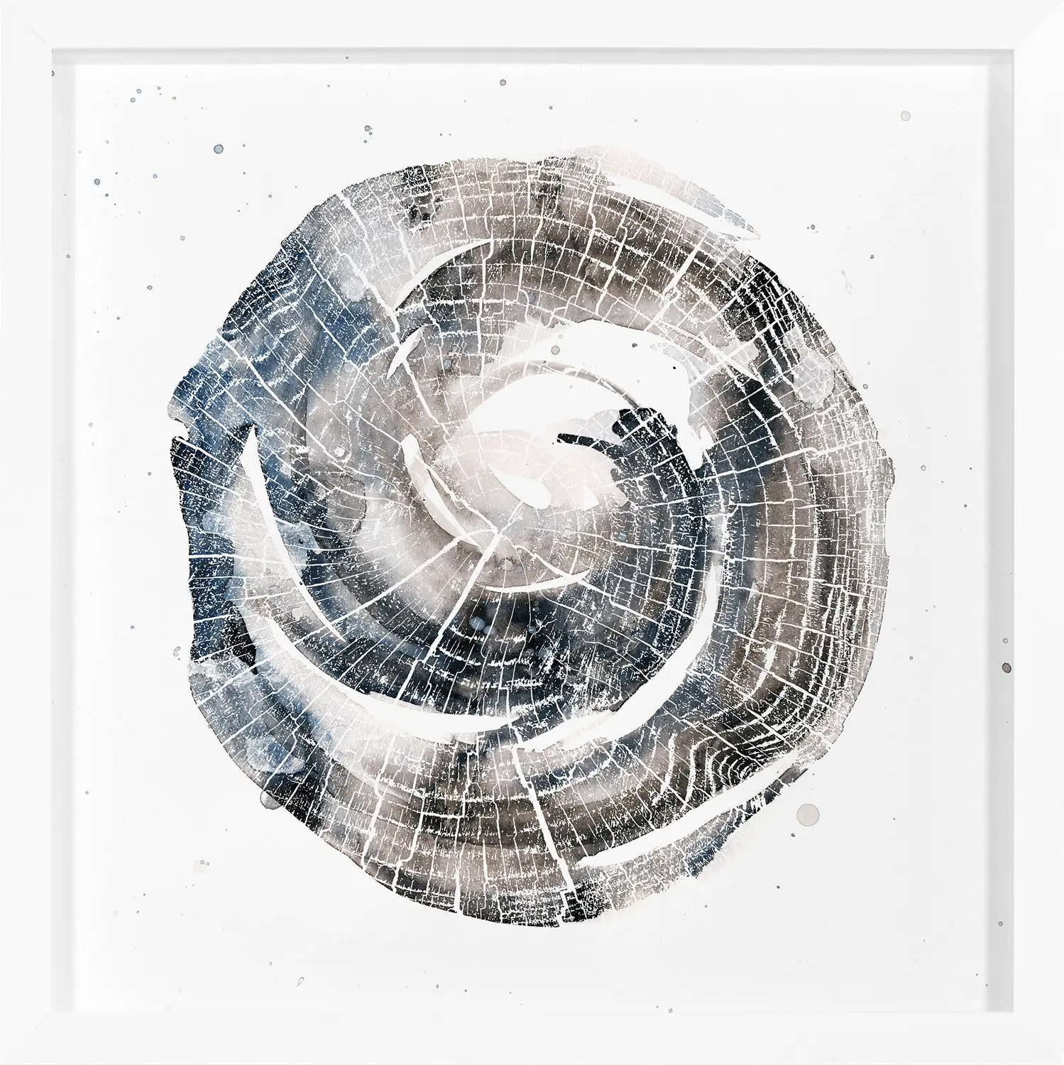 We have layered a composition of tree rings over a neutral toned watercolour touched with a hint of indigo, for a unique image perfect for a modern farmhouse / cottage decor. Crisp white ground is emphasised by white frame space and a bold, deep, white frame.