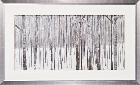 Kathrine Lovell has combined the linear techniques of drawing with the painterly ones of oil paint in this moody, neutral toned, winter landscapes. Framed with a raised matte with conte detail in a two toned silver frame.